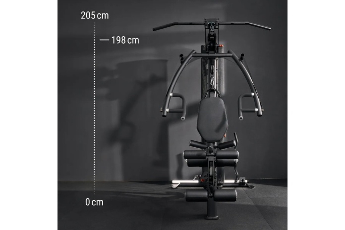 Konstrukcja o wysokości 198 cm pozwala na montaż w pomieszczeniach o standardowej lub obniżonej wysokości sufitu. Zalecana przestrzeń do ćwiczeń to 205 × 220 × 198 cm.