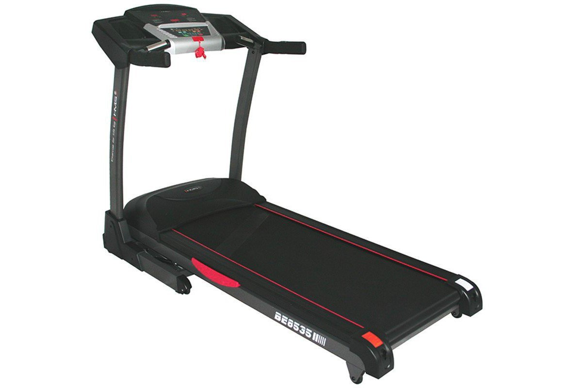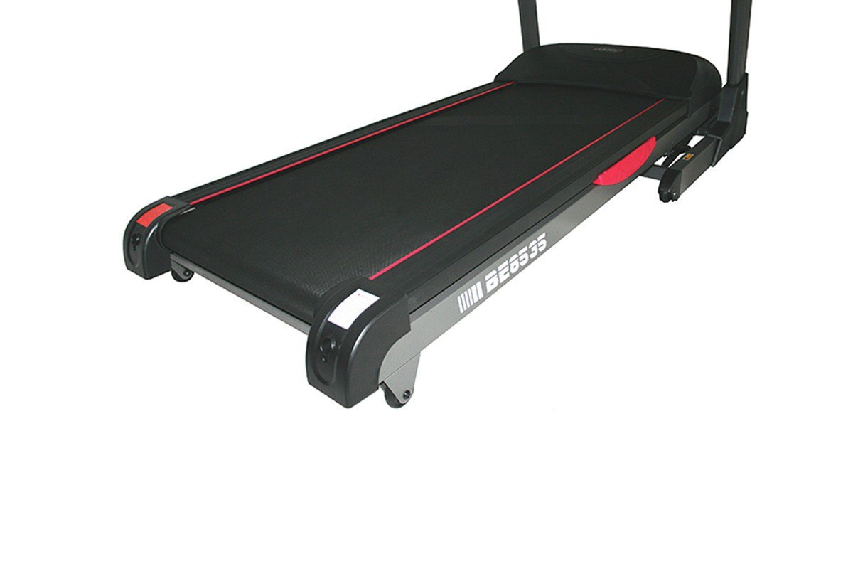 Pas bieżny, który już wcześniej został wspomniany, jest dość szeroki. Wymiary 135 x 54 cm to naprawdę duża przestrzeń dla ćwiczącego. Pozwala na wygodny bieg bez krępowania ruchu nawet dla bardzo wysokiej osoby o wielkich stopach. Wszelkie dokładne dane techniczne znajdziecie poniżej, ale warto wspomnieć o systemie wzmocnionego składania/rozkładania bieżni. Dodatkowe ułatwienia/zabezpieczenia powstały po to, aby użytkownik nie marnował czasu i nerwów na przestawianie. Dwa siłowniki spowalniają bieżnie przy składaniu ok. 50 cm od podłoża, dzięki czemu możemy szybko i gwałtownie złożyć wszystko do mniejszych rozmiarów bez obaw przed uszkodzeniem. Cztery kółka transportowe są dodatkiem wieńczącym aspekt ustawiania bieżni BE8535 i sprawiają, że jest to banalnie proste.