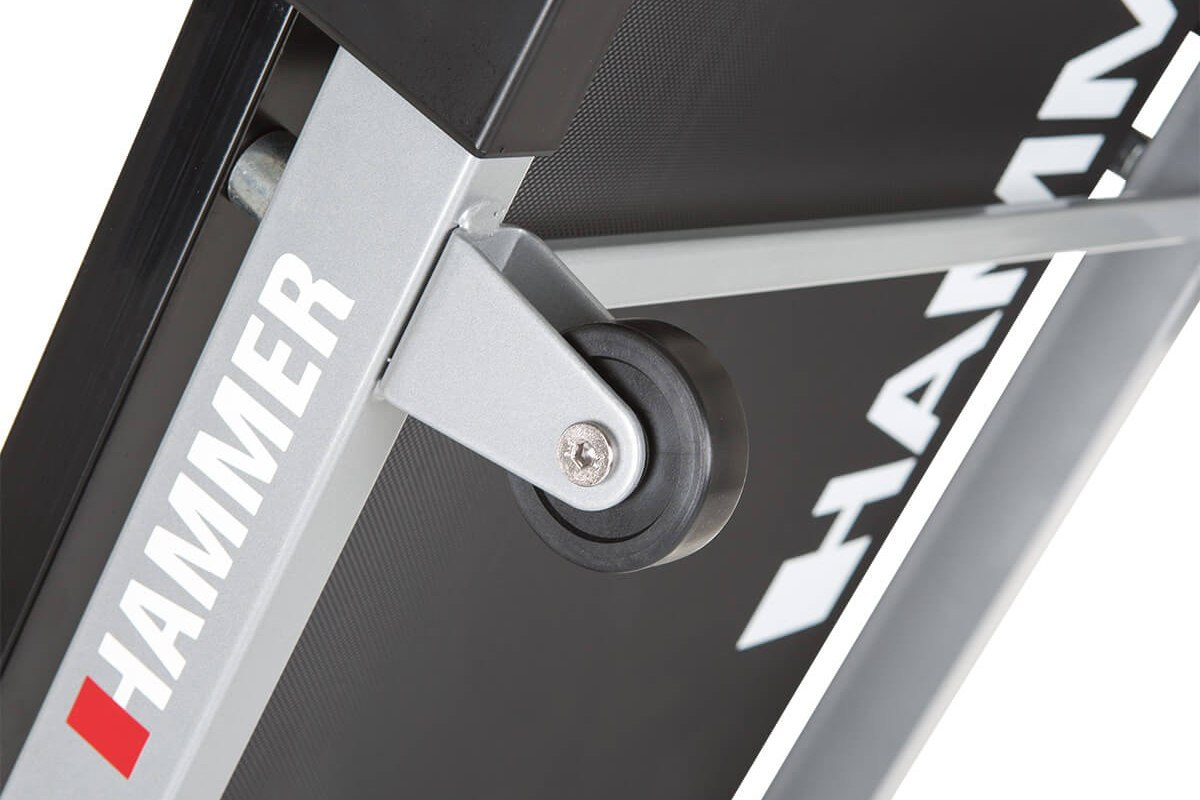 Kompaktowy i składany. Kompaktowe wymiary, lekkość i praktyczne rolki transportowe gwarantują mobilność bieżni Race Runner 2000i firmy HAMMER. Bieżnię można szybko i łatwo rozstawić, jak również przenieść do dowolnego pomieszczenia. Dzięki wysokiej jakości siłowników pas bieżni jest opuszczany powoli i całkowicie automatycznie.