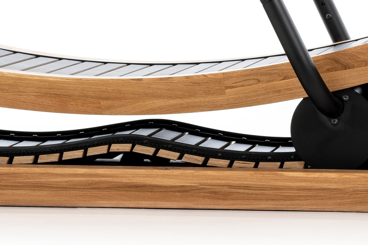 - Pas Flexi-Slat: Każda z 62 drewnianych listew została zaprojektowana tak, aby zapewnić optymalny poziom przyczepności oraz komfort biegu. Drewno, jako materiał naturalny, doskonale amortyzuje wstrząsy, co zmniejsza obciążenie stawów i mięśni, jednocześnie zapewniając płynny i stabilny bieg. Listwy te, poruszające się płynnie w ramie bieżni, odwzorowują naturalny ruch biegowy, co jest szczególnie cenione przez biegaczy szukających autentycznego doświadczenia.
