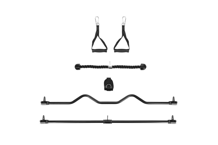 Model ARES PRO dostarczany jest z pełnym zestawem akcesoriów umożliwiających kompleksową realizację planów treningowych. W wyposażeniu znajdują się uchwyty D handle, sznur do tricepsa, opaska na kostkę i nadgarstek, długi drążek prosty, długi drążek łamany oraz uchwyty do przechowywania akcesoriów. W konstrukcji zintegrowano również półkę na tablet i telefon, co ułatwia korzystanie z aplikacji treningowych.