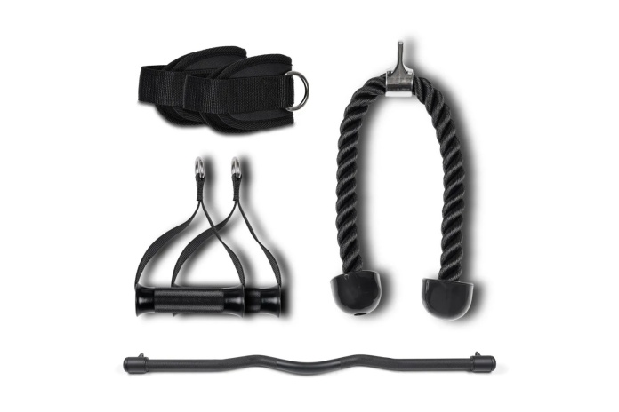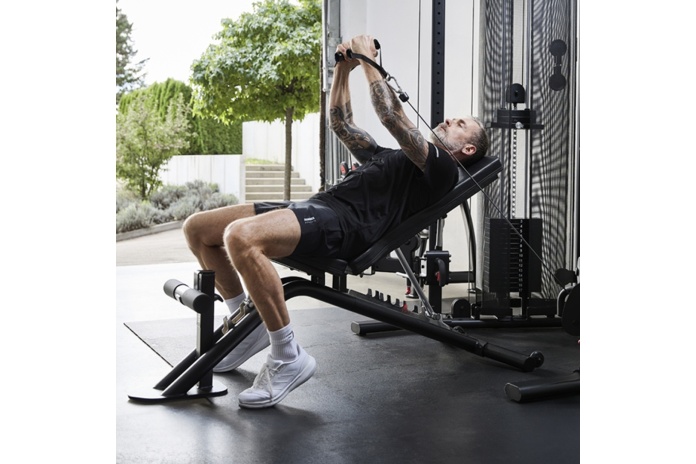 Antypoślizgowa podstawa, Antypoślizgowy uchwyt, Możliwość złożenia ławki, Regulacja kąta nachylenia, Regulacja napięcia linek, Regulacja oparcia, Regulacja siedziska, Regulacja wysokości sztangi, Uchwyt na tablet / smartfon