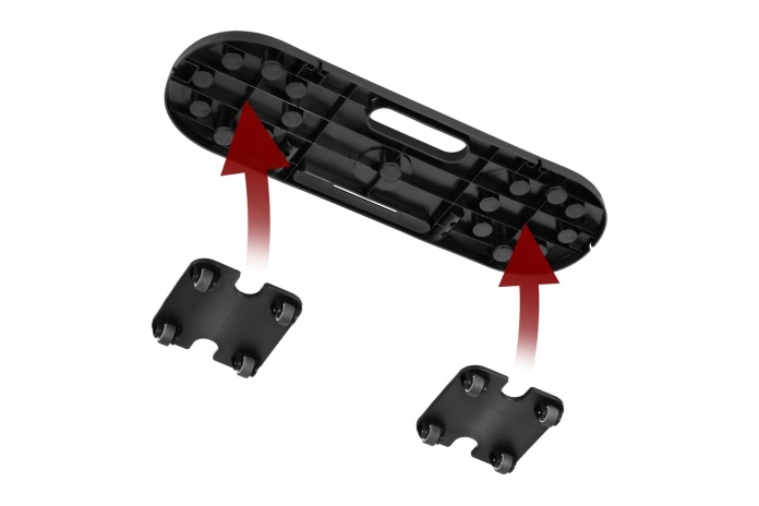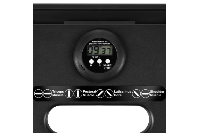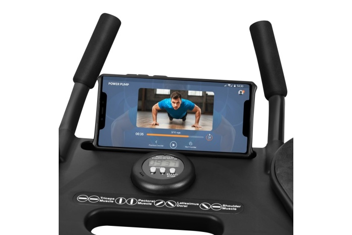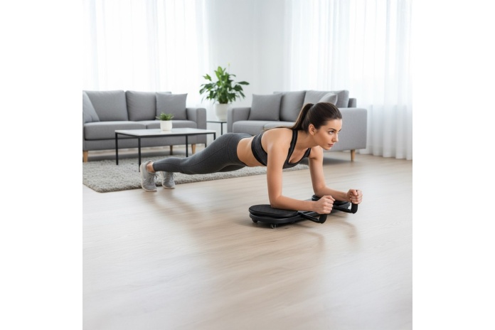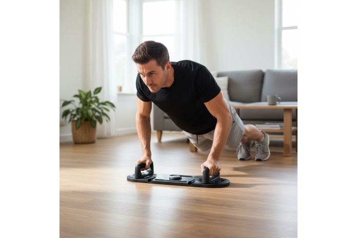 Zestaw oferuje funkcje 3w1: różne ustawienia chwytu w pompkach, ćwiczenia core i mięśni brzucha (plank, rollout) oraz trening z linkami oporowymi. Precyzyjny licznik odmierza minuty i sekundy i umożliwia szybki start, stop oraz reset. Modułowa konstrukcja pozwala zamontować kółka pod platformy, co umożliwia płynne ruchy w przód i tył oraz w bok. Deska zapewnia komfort i stabilność dzięki grubym, antypoślizgowym podkładkom pod łokcie i dłonie oraz piankowym uchwytom. Konstrukcja jest kompaktowa, łatwa do przenoszenia i wygodna w przechowywaniu.