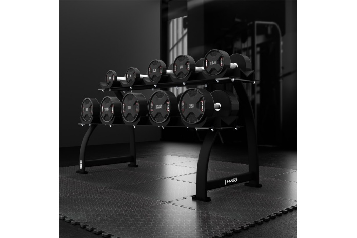 Waga: 2 x 2,5 kg / 2 x 5 kg / 2 x 7,5 kg / 2 x 10 kg / 2 x 12,5 kg / 2 x 15 kg / 2 x 17,5 kg / 2 x 20 kg / 2 x 22,5 kg / 2 x 25 kg
