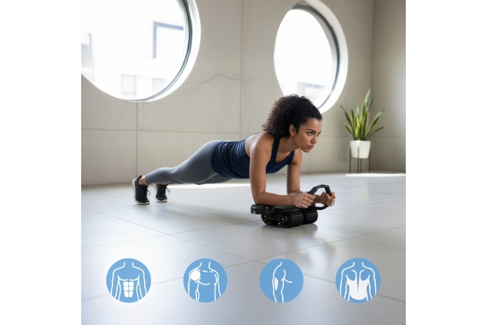 Cztery koła z antypoślizgową, gumowaną powierzchnią oraz poszerzony rozstaw zapewniają pewne prowadzenie także na gładkich nawierzchniach. Konstrukcja równomiernie rozkłada obciążenia, co ogranicza kompensację siłą ramion i wspiera zaangażowanie mięśni brzucha.
