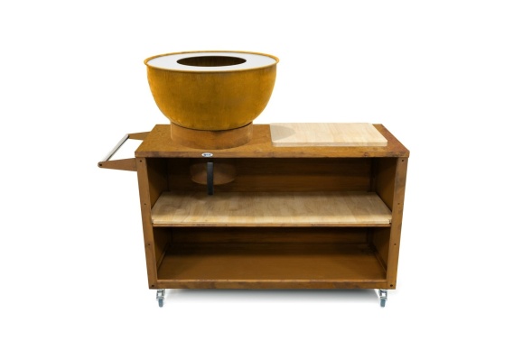 Praktyczne szafki pod misą pomieszczą drewno i akcesoria, ułatwiając organizację pracy. Całość osadzona jest na stabilnej podstawie z kółkami, co umożliwia łatwe przestawienie kuchni lub schowanie jej po zakończonym użytkowaniu. Dodatkowo, pod misą umieszczony został pojemnik na popiół, który znacznie ułatwia czyszczenie i konserwację.
