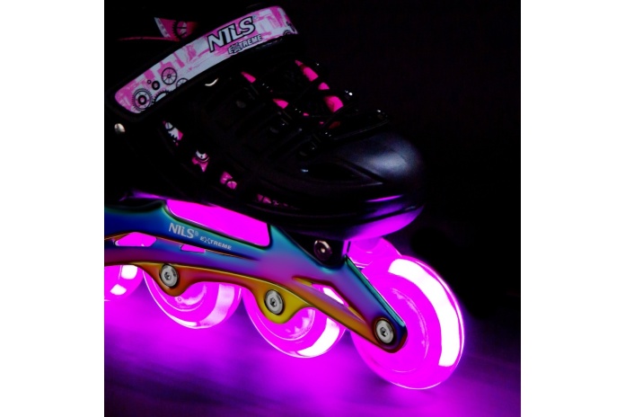 Łyżworlki regulowane NH10905 4w1 Różowe-Rainbow LED Nils Extreme to wszechstronny zestaw, który łączy w sobie aż cztery konfiguracje: łyżwy, łyżworolki, wrotki oraz rolko wrotki. Jeden model pozwala korzystać zarówno z uroków jazdy po lodzie, jak i dynamicznej jazdy na asfalcie. Dodatkowym atutem są świecące kółka LED, które nadają całości efektowny wygląd i zwiększają widoczność podczas jazdy.