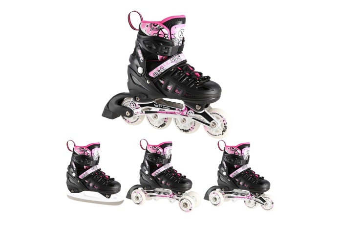 Łyżworlki regulowane NH10905 4w1 Różowe LED Nils Extreme to wszechstronny zestaw, który łączy w sobie aż cztery konfiguracje: łyżwy, łyżworolki, wrotki oraz rolko wrotki. Jeden model pozwala korzystać zarówno z uroków jazdy po lodzie, jak i dynamicznej jazdy na asfalcie. Dodatkowym atutem są świecące kółka LED, które nadają całości efektowny wygląd i zwiększają widoczność podczas jazdy.