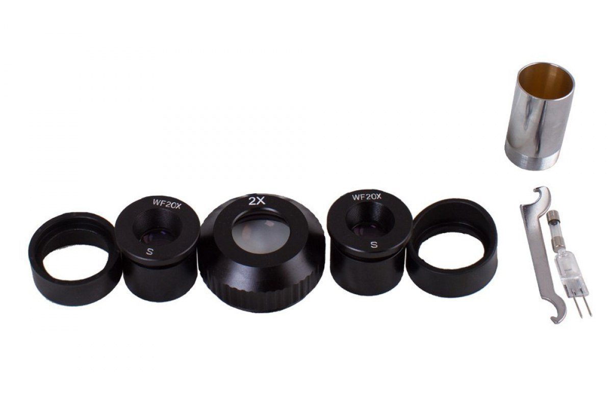 Mikroskop łączy stereoskopowy obiektyw powiększający (1x-4x) z dwiema parami okularów o szeroki polu widzenia (10x i 20x). Dzięki szkłu pokrytym wielowarstwową powłoką, mikroskop zawsze zapewnia jasny obraz o wysokim kontraście, bez zniekształceń i z doskonałym odwzorowaniem kolorów. Dołączony jest niebieski filtr, który zwiększa kontrast. Konstrukcja głowicy o regulowanej wysokości pozwala na montaż kamery i obserwację próbki przez dwa okulary oraz wykonywanie zdjęć i nagrywanie filmów. Dla zwiększenia wygody obserwacji możliwa jest regulacja rozstawu okularów oraz dioptrii. Dwie jasne żarówki halogenowe mogą zostać włączone oddzielnie lub jednocześnie. Podświetlenie zasilane jest przez przewód zasilający.