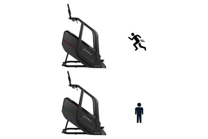 Schody wyposażono w inteligentne podświetlenie, które pełni funkcję sygnalizacyjną. Zielone światło informuje o gotowości do pracy, czerwone oznacza aktywny trening, a po odłączeniu od zasilania podświetlenie całkowicie gaśnie. To proste i czytelne rozwiązanie poprawia komfort obsługi.