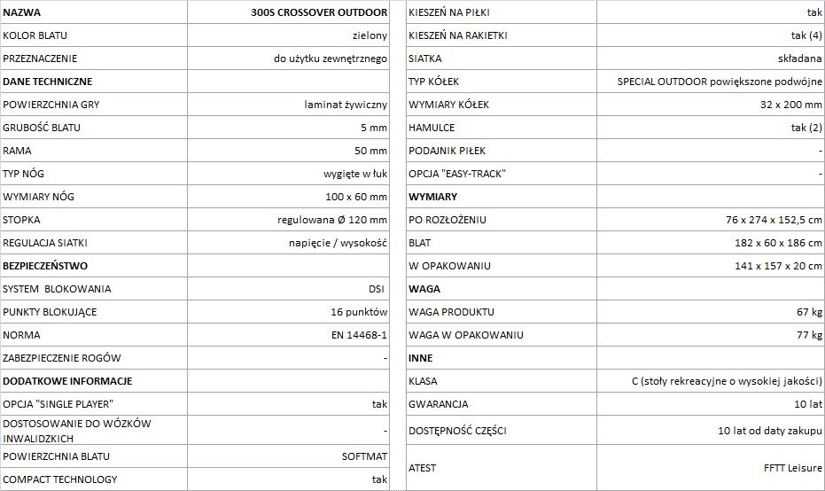 - Klasa: C (stoły rekreacyjne o wysokiej jakości)