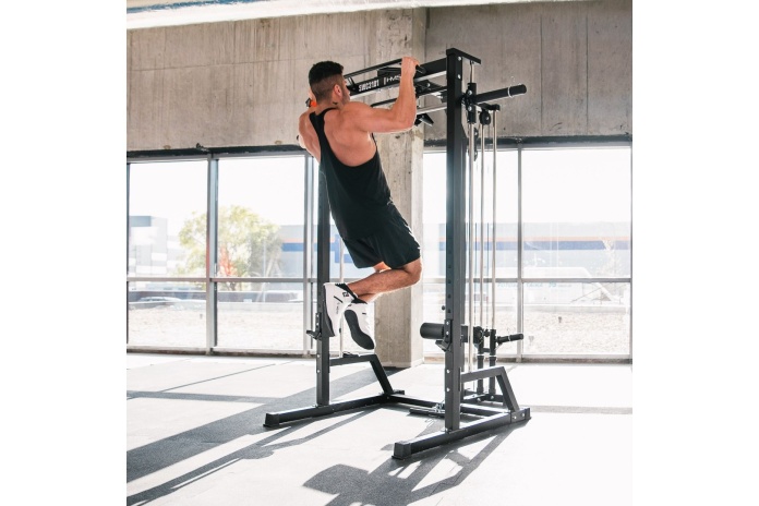 • Wielopozycyjną stację z drążkiem do podciągania, który oferuje wiele możliwości chwytu: wąski, szeroki, neutralny, skośny, podchwyt i nachwyt, co pozwala na kompleksowy trening pleców i ramion w jednym urządzeniu.