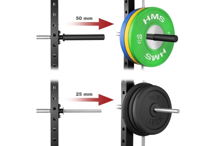 SWC3101 działa w 100% na talerzach obciążeniowych, bez stosów wagowych. Sprzęt jest domyślnie kompatybilny z talerzami olimpijskimi 50 mm, a zdejmowane nakładki umożliwiają także użycie talerzy 25 mm. Korzyści: