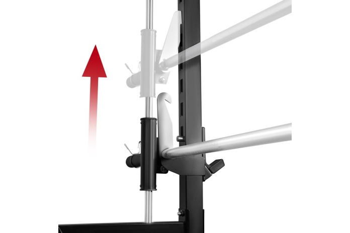 Prowadnice ze stali nierdzewnej zapewniają wysoki poziom sztywności i płynny ruch sztangi. System blokowania oparty na stalowych zaczepach umożliwia bezpieczne odłożenie sztangi na dowolnej wysokości