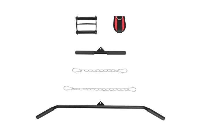 • Akcesoria do wyciągu: uchwyt trójkątny, opaska na kostkę i nadgarstek, uchwyt prosty krótki, dwa łańcuchy i długi drążek łamany