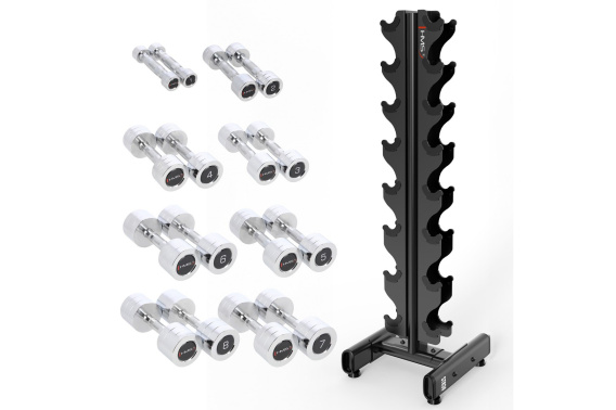 ✔ Nowoczesny design – chromowane hantle i estetyczny stojak idealnie komponują się w każdej przestrzeni